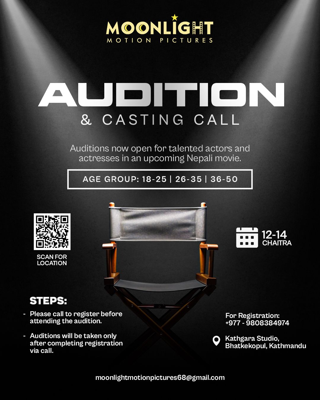 निर्माण पक्षले जारी गरेको पोस्टर अनुसार यस चलचित्रका लागि १८ देखि २५ वर्ष, २६ देखि ३५ वर्ष र ३६ देखि ५० वर्ष उमेर समूहका प्रतिभाशाली अभिनेता तथा अभिनेत्रीहरूको खोजी भइरहेको छ। इच्छुक नवोदित तथा अनुभवी कलाकारहरूले आगामी चैत्र १२ गतेदेखि १४ गतेसम्म हुने अडिसनमा सहभागी हुन सक्नेछन्। काठमाडौँको भत्केको पुलस्थित कठघरा स्टुडियोमा अडिसन सञ्चालन हुनेछ। तर, अडिसनमा सहभागी हुन चाहनेले अनिवार्य रूपमा सम्पर्क नम्बर ९८०८३८४९७४ मा फोन गरेर पूर्व-दर्ता गराउनुपर्ने नियम लागू गरिएको छ। फोन मार्फत दर्ता प्रक्रिया पूरा गरेपछि मात्र अडिसन दिन पाइने पोस्टरमा स्पष्ट पारिएको छ।